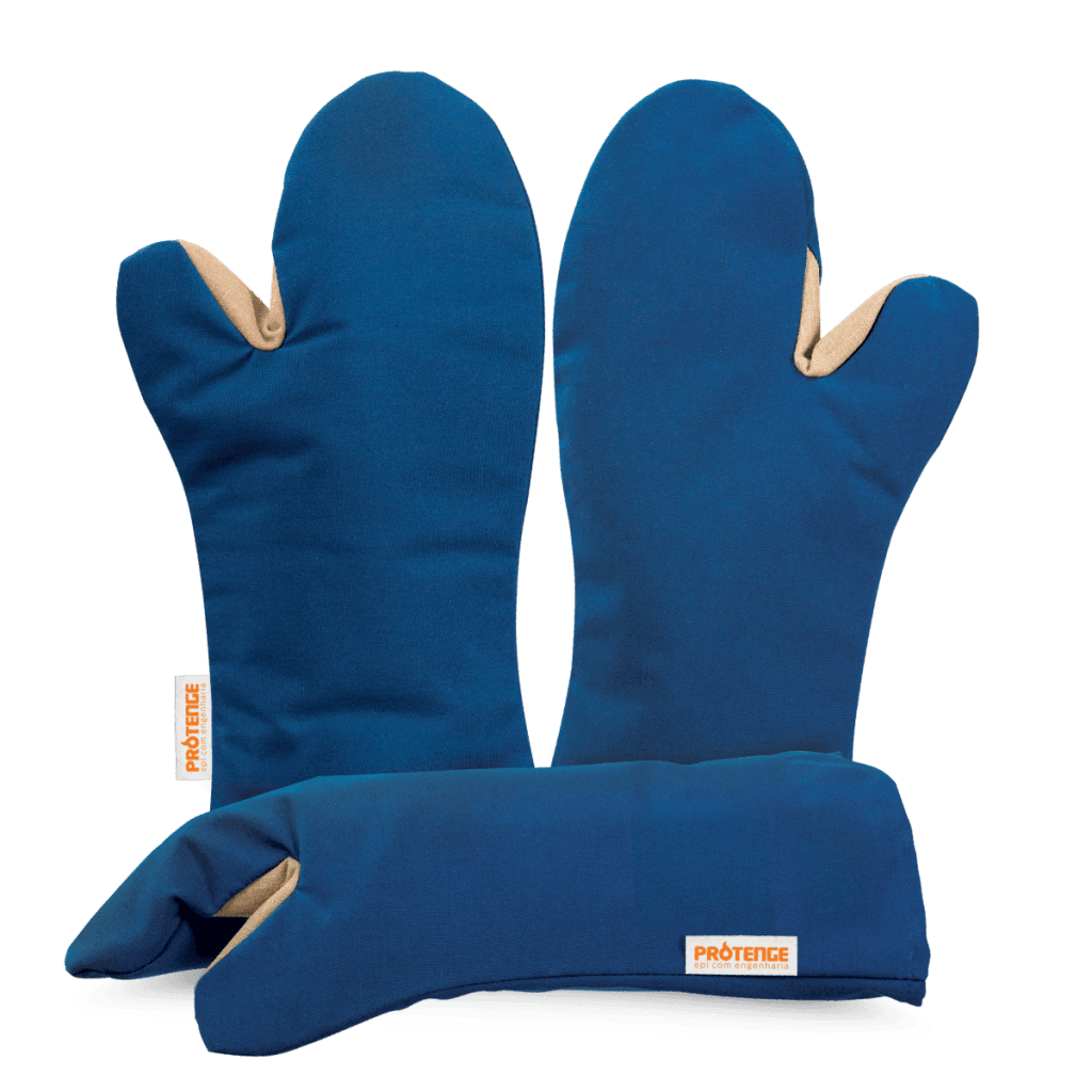 Luva de proteção modelo 2 dedos mão-de-gato, para calor normal, confeccionada em tecido meta-aramida, retardante a chamas (FR), denominado Protex® K, com tratamento impermeabilizante e atóxico. Modelo com forro destacável em feltro de poliéster e tecido 100% algodão retardante a chamas (FR). Comprimentos disponíveis: 38cm, 45cm ou 60cm. Luva confeccionada com matéria-prima durável, higienizável e de longa vida útil.