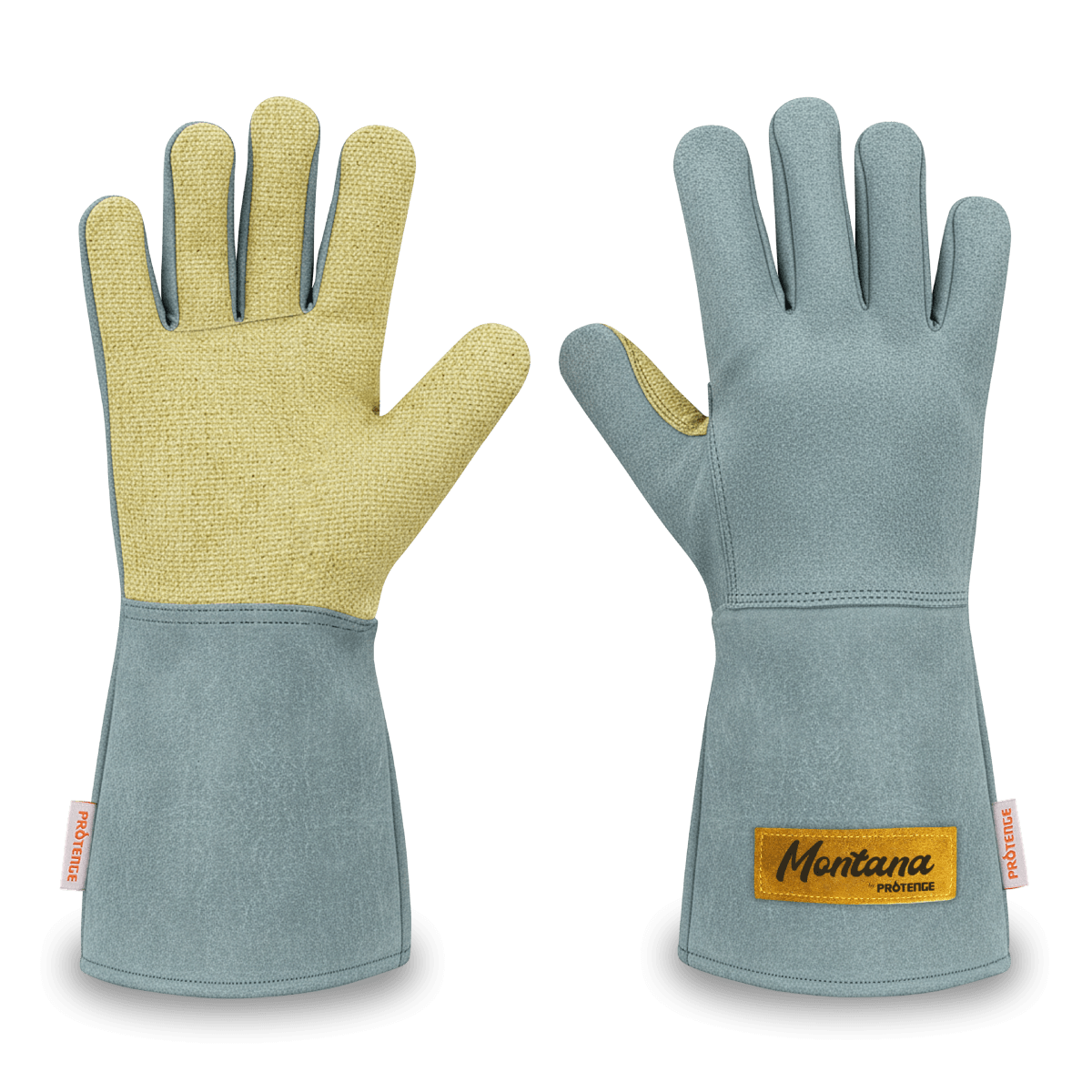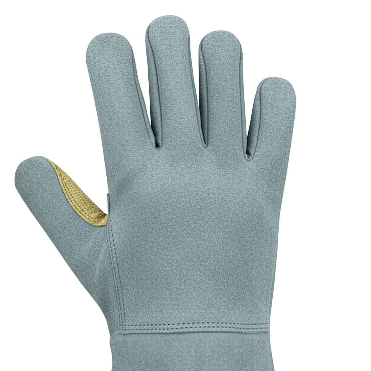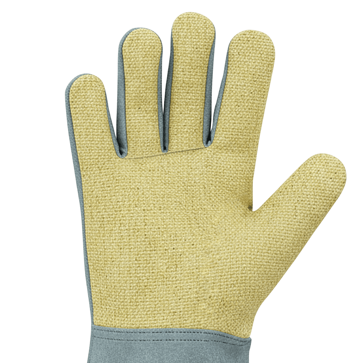Luva de proteção contra altas temperaturas. Modelo padrão 5 dedos. Confeccionada em Protex® 1000 by Protenge na região da palma. Dorso e punhos em raspa FR. Forração interna em tecido FR para maior conforto das mãos. Punhos longos em raspa FR com 20cm com forração em tecido FR. Comprimento total da luva aproximadamente 40cm. Costuras em linha de aramida.